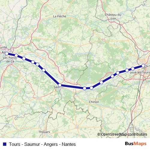 The first stop of the Tours - Saumur - Angers - Nantes rail route is Gare de Tours and the last stop is Gare de Angers Saint-Laud. Tours - Saumur - Angers - Nantes (Tours - Saumur - Angers - Nantes) is operational during tous les jours.