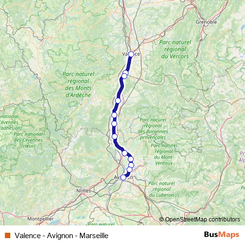 See why over 2 million users trust and consider busmaps.com as the best public transport website. busmaps gives you Avignon Rail Services suggested routes, real-time bus tracker, line route maps in Avignon, and helps to find the closest Valence - Avignon - Marseille rail stops near you. No internet available? Download an offline PDF map and bus schedule for the Valence - Avignon - Marseille rail to take on your trip.