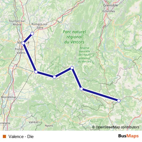 The first stop of the Valence - Die bus route is Valence TGV Rhône-Alpes Sud and the last stop is Dévoluy. Valence - Die (Valence - Die) is operational during tous les jours.