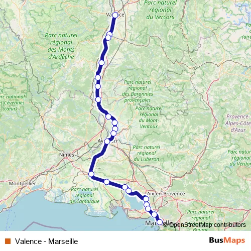 See why over 2 million users trust and consider busmaps.com as the best public transport website. busmaps gives you Marseille Rail Services suggested routes, real-time bus tracker, line route maps in Marseille, and helps to find the closest Valence - Marseille rail stops near you. No internet available? Download an offline PDF map and bus schedule for the Valence - Marseille rail to take on your trip.