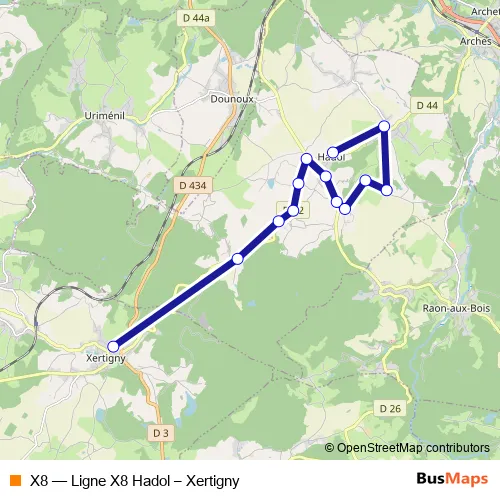 Click here to view the nearest X8 - Ligne X8 Hadol – Xertigny bus stop.