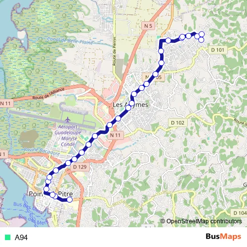See why over 2 million users trust and consider busmaps.com as the best public transport website. busmaps gives you Pointe-a-Pitre Buses suggested routes, real-time bus tracker, line route maps in Pointe-a-Pitre, and helps to find the closest A94 bus stops near you. No internet available? Download an offline PDF map and bus schedule for the A94 bus to take on your trip.