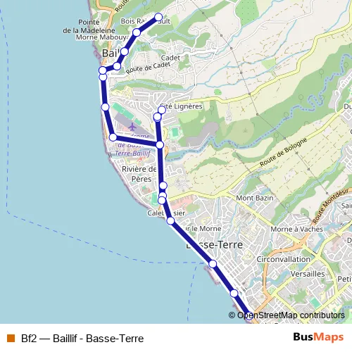 The first stop of the Bf2 bus route is Gare routière De Basse-Terre and the last stop is Mairie De Baillif. Bf2 (Baillif - Basse-Terre) is operational during tous les jours.