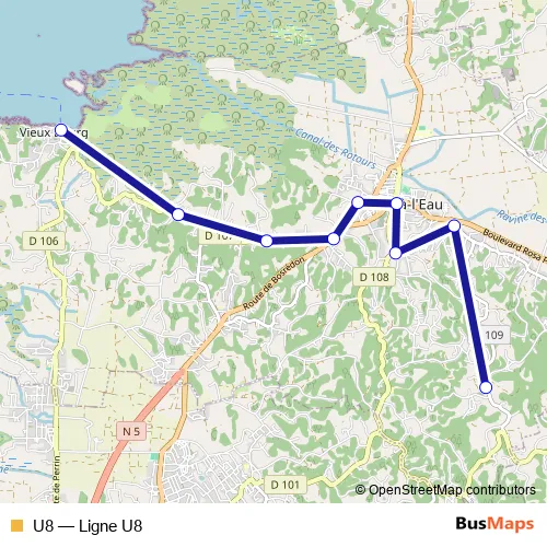 The first stop of the U8 bus route is Vieux Bourg and the last stop is Ecole Jabrun Saint Cyr. U8 (Ligne U8) is operational during tous les jours.