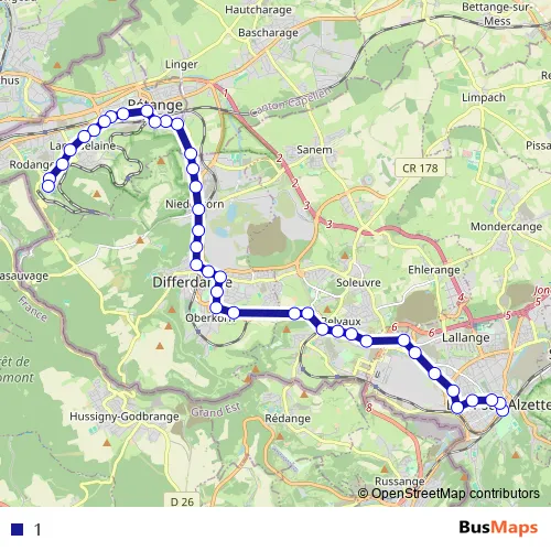 The first stop of the 1 bus route is Esch-sur-Alzette, Gare routière and the last stop is Rodange, Schwemm. 1 is operational during tous les jours.