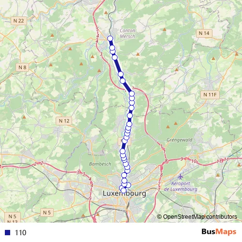 See why over 2 million users trust and consider busmaps.com as the best public transport website. busmaps gives you Luxembourg Buses suggested routes, real-time bus tracker, line route maps in Luxembourg, and helps to find the closest 110 bus stops near you. No internet available? Download an offline PDF map and bus schedule for the 110 bus to take on your trip.