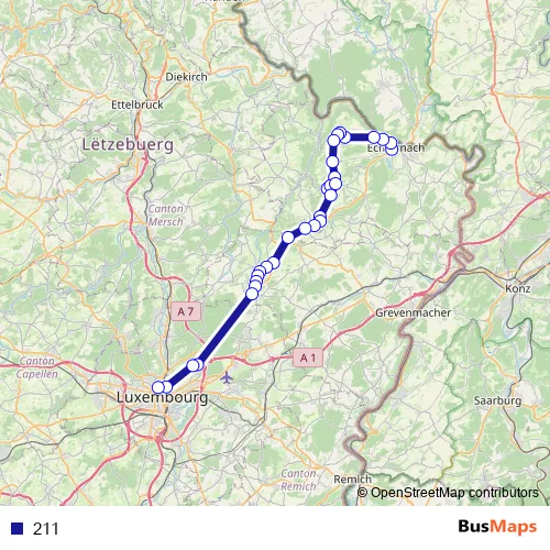 The first stop of the 211 bus route is Echternach, Gare Centre and the last stop is Limpertsberg, Theater (Bus). 211 is operational during tous les jours.