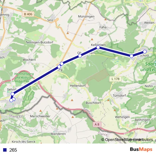 The first stop of the 265 bus route is Grundschule, Perl and the last stop is Gemeinschaftsschule, Orscholz Mettlach. 265 is operational during en semaine.