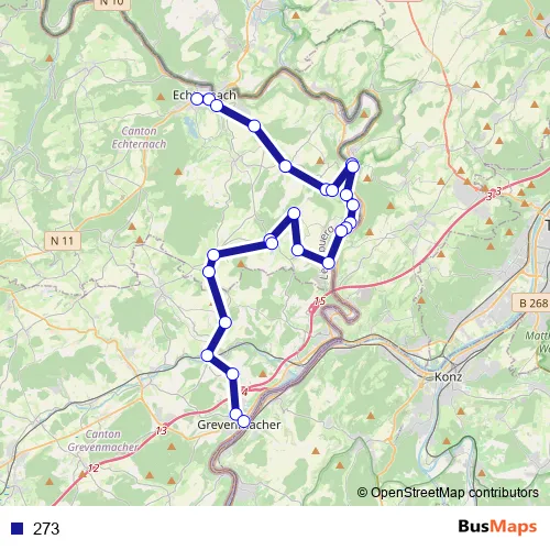 The first stop of the 273 bus route is Echternach, Gare Centre and the last stop is Grevenmacher, Gare routière. 273 is operational during tous les jours.