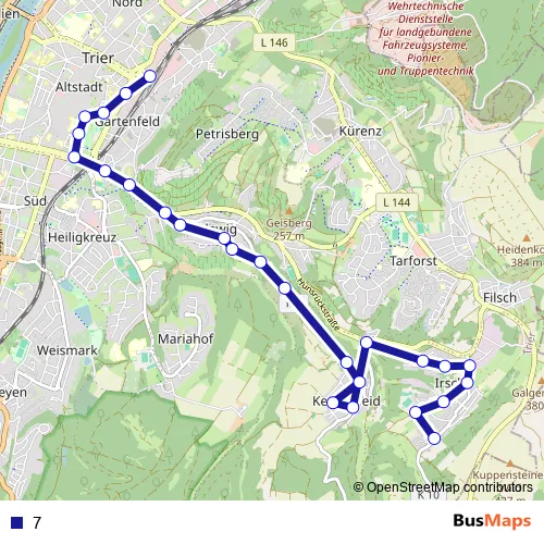 Hockweilerstraße - Nicetiusstraße - Propstei - Georgstraße - Irscher Straße - Mühlenstraße - Brubacher Weg - Stefan-Andres-Straße - Jakob-Kneip-Straße - Zum Hellberg - Kernscheider Höhenweg - Caspar-Olevian-Straße - St.-Anna-Straße - Olewiger Straße - Kaiserstraße - Weberbach - Mustorstraße - Ostallee