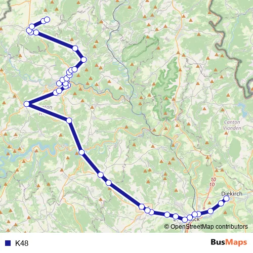 The first stop of the K48 bus route is Diekirch, Gare routière and the last stop is Brachtenbach, Bei der Kirich. K48 is operational during en semaine.