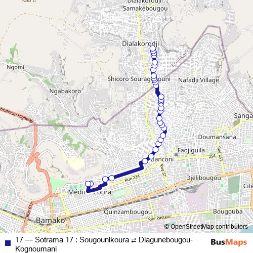 See why over 2 million users trust and consider busmaps.com as the best public transport website. busmaps gives you Bamako Buses suggested routes, real-time bus tracker, line route maps in Bamako, and helps to find the closest 17 bus stops near you. No internet available? Download an offline PDF map and bus schedule for the 17 bus to take on your trip.