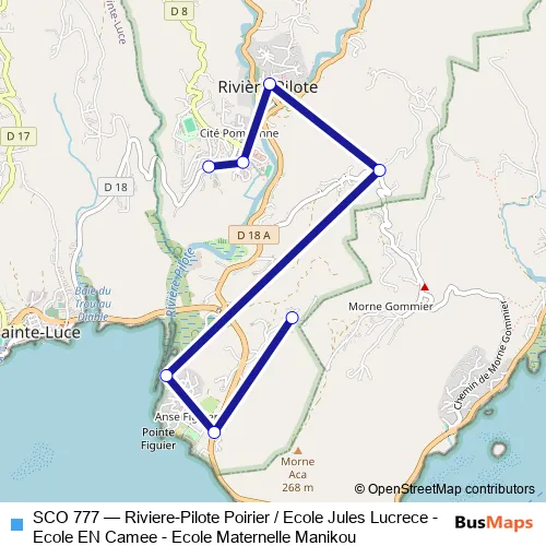 See why over 2 million users trust and consider busmaps.com as the best public transport website. busmaps gives you Riviere-Pilote Buses suggested routes, real-time bus tracker, line route maps in Riviere-Pilote, and helps to find the closest SCO 777 bus stops near you. No internet available? Download an offline PDF map and bus schedule for the SCO 777 bus to take on your trip.