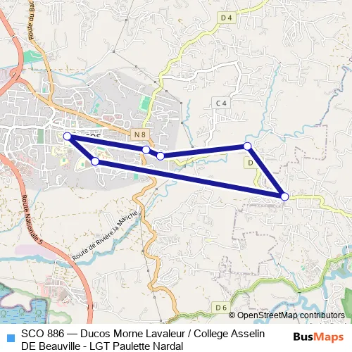Click here to view the nearest SCO 886 - Ducos Morne Lavaleur / College Asselin DE Beauville - LGT Paulette Nardal bus stop.
