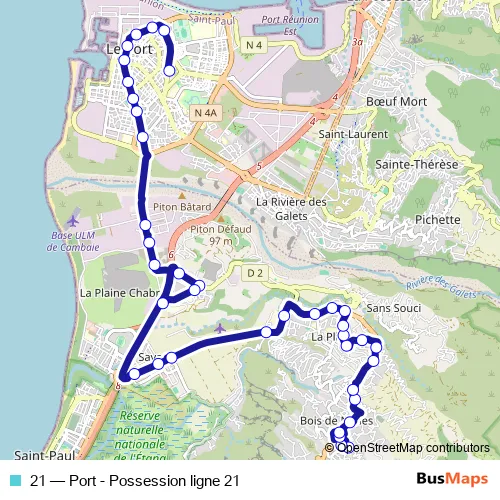 The first stop of the 21 bus route is Piscine Bois de Nèfles and the last stop is Pôle d'Echanges. 21 (Port - Possession ligne 21) is operational during tous les jours.