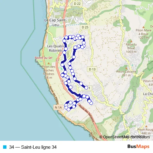 The first stop of the 34 bus route is Terminus Chemin St-Paul and the last stop is Mairie du Piton. 34 (Saint-Leu ligne 34) is operational during tous les jours.