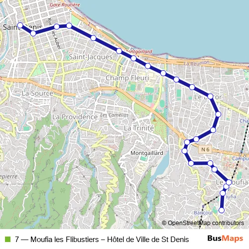 The first stop of the 7 bus route is Moufia les Flibustiers and the last stop is Hôtel de Ville de St Denis. 7 (Moufia les Flibustiers – Hôtel de Ville de St Denis) is operational during tous les jours.