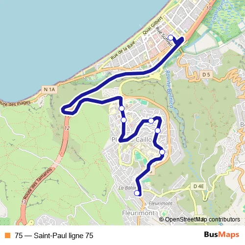 The first stop of the 75 bus route is Gare Routière and the last stop is Déchetterie Plateau Caillou. 75 (Saint-Paul ligne 75) is operational during tous les jours.