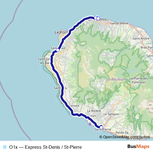 The first stop of the O1x bus route is Gare de St-Pierre and the last stop is Gare de St-Denis. O1x (Express St-Denis / St-Pierre) is operational during tous les jours.