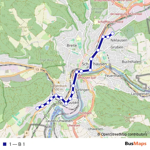 The first stop of the 1 bus route is Schaffhausen, Ebnat and the last stop is Neuhausen, Herbstäcker. 1 (B 1) is operational during tous les jours.