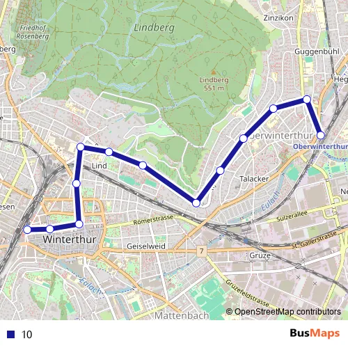 The first stop of the 10 bus route is Oberwinterthur, Bahnhof and the last stop is Winterthur, Hauptbahnhof. 10 is operational during tous les jours.