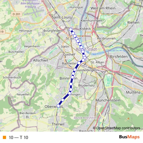 The first stop of the 10 tram route is Basel, St-Louis Grenze and the last stop is Oberwil BL, Zentrum. 10 (T 10) is operational during le week-end.