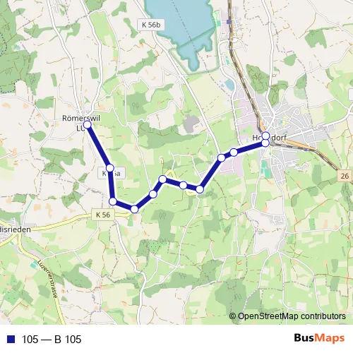 The first stop of the 105 bus route is Römerswil LU, Dorf and the last stop is Hochdorf, Bahnhof. 105 (B 105) is operational during tous les jours.