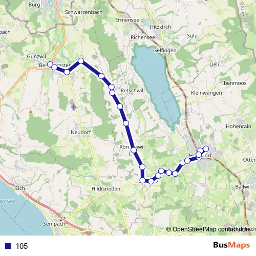 The first stop of the 105 bus route is Beromünster, Post and the last stop is Hochdorf, Bahnhof. 105 is operational during tous les jours.