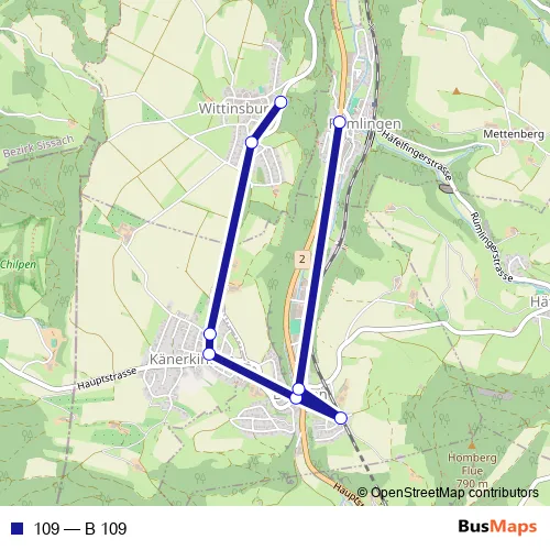 The first stop of the 109 bus route is Wittinsburg, Chamber and the last stop is Rümlingen, Dorf. 109 (B 109) is operational during tous les jours.