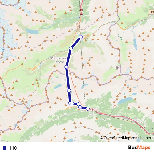 The first stop of the 110 bus route is Andermatt, Bahnhofplatz and the last stop is Airolo, Stazione. 110 is operational during tous les jours.