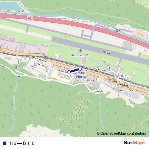 The first stop of the 116 bus route is Ambrì, centro scolastico and the last stop is Ambrì-Piotta, Stazione. 116 (B 116) is operational during en semaine.