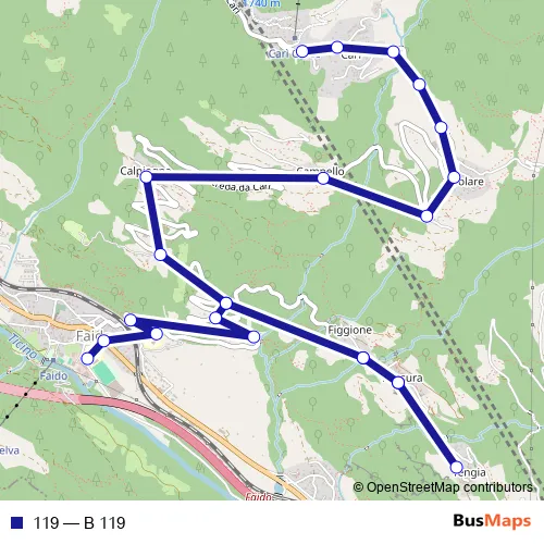 The first stop of the 119 bus route is Faido, centro scolastico and the last stop is Carì, Paese. 119 (B 119) is operational during tous les jours.