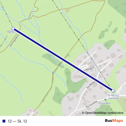 The first stop of the 12 cable-car route is Randolins and the last stop is St. Moritz Suvretta. 12 (SL 12) is operational during tous les jours.
