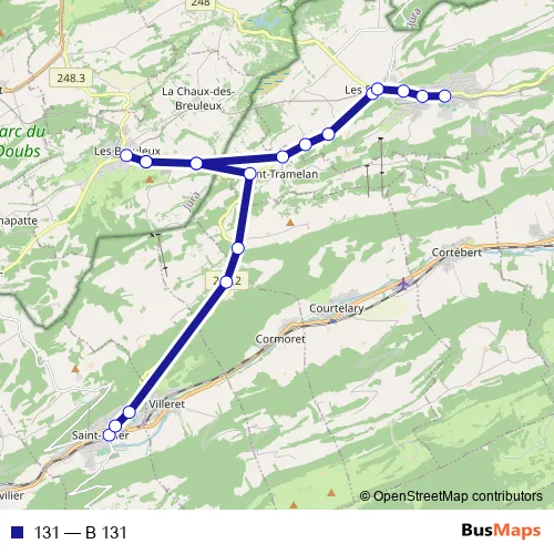 The first stop of the 131 bus route is St-Imier, gare and the last stop is Tramelan, gare. 131 (B 131) is operational during tous les jours.