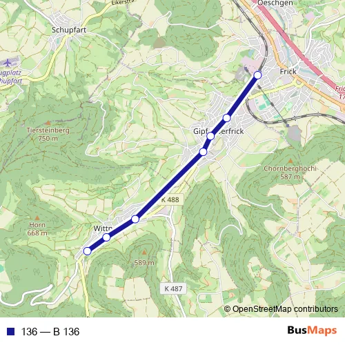 The first stop of the 136 bus route is Frick, Bahnhof and the last stop is Wittnau, Obere Gasse. 136 (B 136) is operational during en semaine.