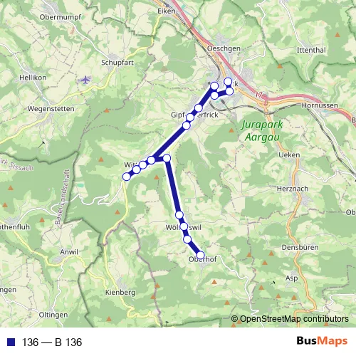 The first stop of the 136 bus route is Frick, Unterdorf and the last stop is Oberhof, Adlerplatz. 136 (B 136) is operational during tous les jours.