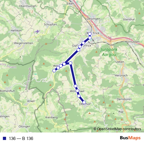 The first stop of the 136 bus route is Oberhof, Adlerplatz and the last stop is Frick, Bahnhof. 136 (B 136) is operational during tous les jours.