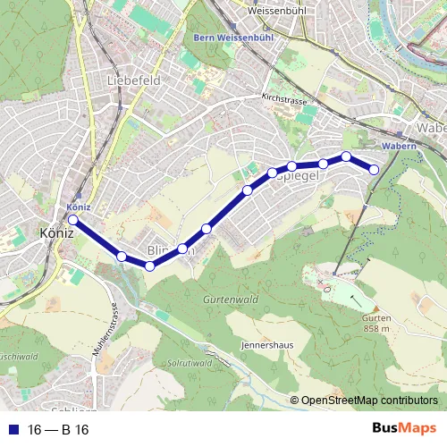 The first stop of the 16 bus route is Köniz, Zentrum and the last stop is Spiegel, Gurten-Gartenstadt. 16 (B 16) is operational during tous les jours.