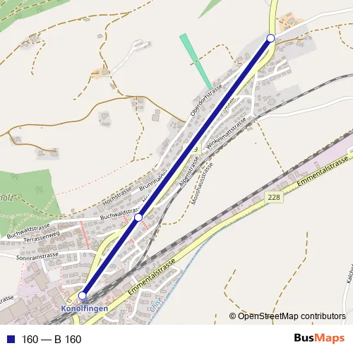 The first stop of the 160 bus route is Konolfingen, Bahnhof and the last stop is Konolfingen, Dorf. 160 (B 160) is operational during le week-end.