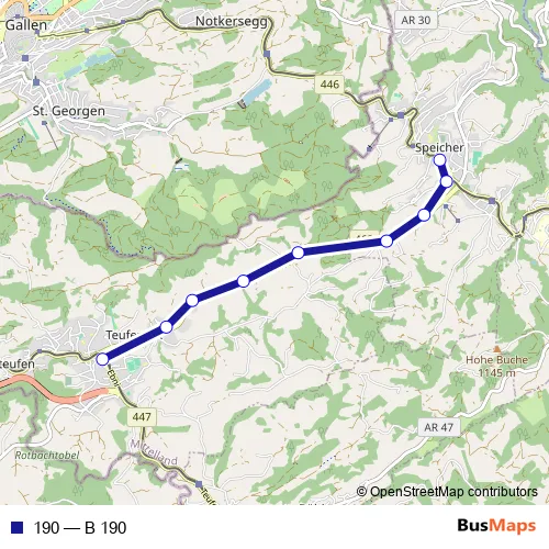 The first stop of the 190 bus route is Teufen AR, Bahnhof and the last stop is Speicher, Bahnhof. 190 (B 190) is operational during le week-end.