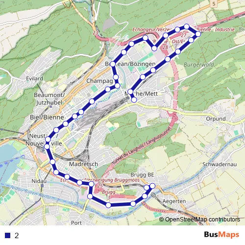 The first stop of the 2 bus route is Brügg BE, Bahnhof and the last stop is Biel/Bienne, Orpundplatz. 2 is operational during tous les jours.