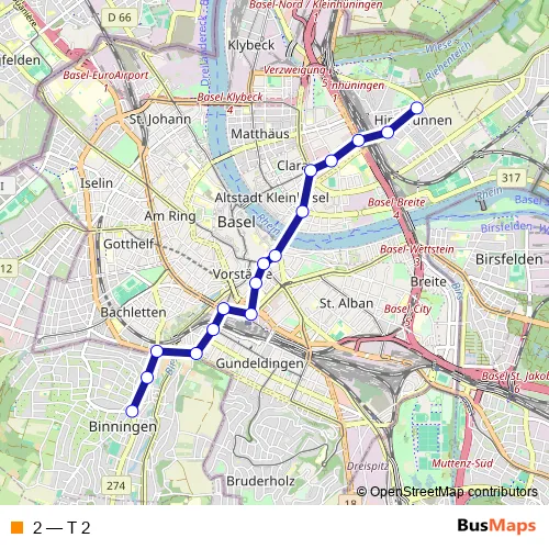See why over 2 million users trust and consider busmaps.com as the best public transport website. busmaps gives you Basel Trams suggested routes, real-time bus tracker, line route maps in Basel, and helps to find the closest 2 tram stops near you. No internet available? Download an offline PDF map and bus schedule for the 2 tram to take on your trip.