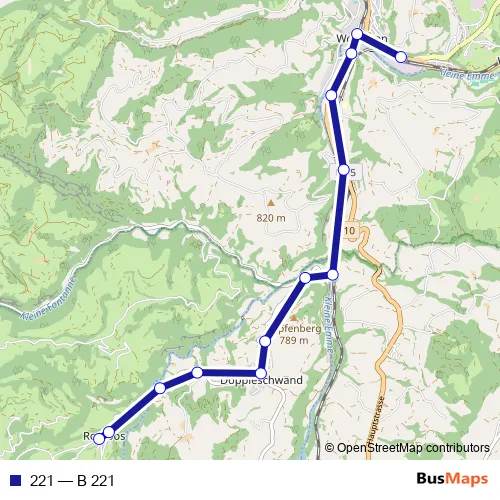 The first stop of the 221 bus route is Romoos, Post and the last stop is Wolhusen, Bahnhof. 221 (B 221) is operational during tous les jours.