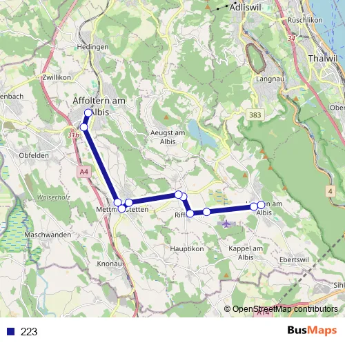 The first stop of the 223 bus route is Hausen a.A., Post and the last stop is Affoltern a.A., Bahnhof. 223 is operational during tous les jours.