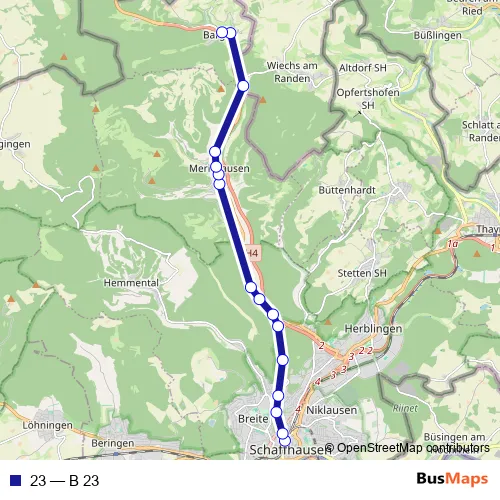 The first stop of the 23 bus route is Schaffhausen, Bahnhof Nord and the last stop is Bargen SH, Dorf. 23 (B 23) is operational during tous les jours.
