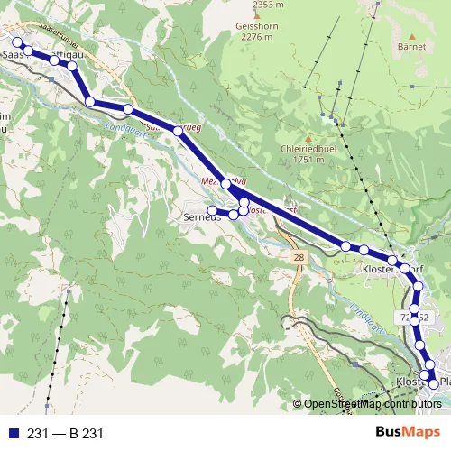 The first stop of the 231 bus route is Saas i.P., Ufm Ried and the last stop is Klosters Platz, Bahnhof. 231 (B 231) is operational during tous les jours.