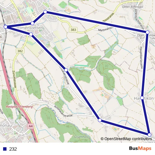 The first stop of the 232 bus route is Mettmenstetten, Bahnhof and the last stop is Mettmenstetten, Bahnhof. 232 is operational during en semaine.