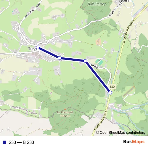 The first stop of the 233 bus route is Treyvaux, village and the last stop is Treyvaux, Le Pratzey. 233 (B 233) is operational during en semaine.