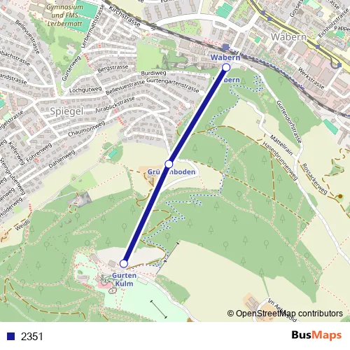 The first stop of the 2351 funicular route is Gurten Kulm and the last stop is Wabern (Gurtenbahn). 2351 is operational during tous les jours.