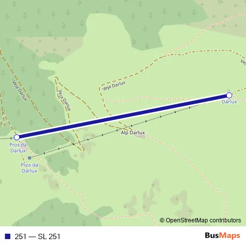 The first stop of the 251 cable-car route is Alp Darlux and the last stop is Pros da Darlux. 251 (SL 251) is operational during tous les jours.